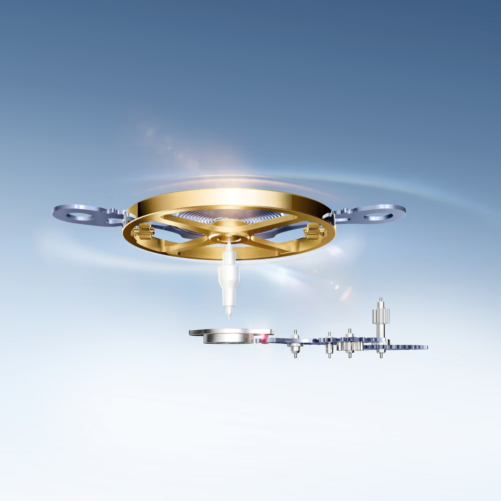 To accommodate the ceramic balance staff within the hairspring and balance wheel assembly, the Paraflex shock absorber has been optimized. The improved design features a highly flexible internal “double-cone” structure. The central jewel is crafted using a new patented process that blends cutting-edge technology with traditional craftsmanship. Both ends of the balance staff are equipped with the upgraded Paraflex shock absorbers, which include enhanced spring blades to ensure precise reset after impact. This system guarantees stable oscillation of the balance staff in all positions.