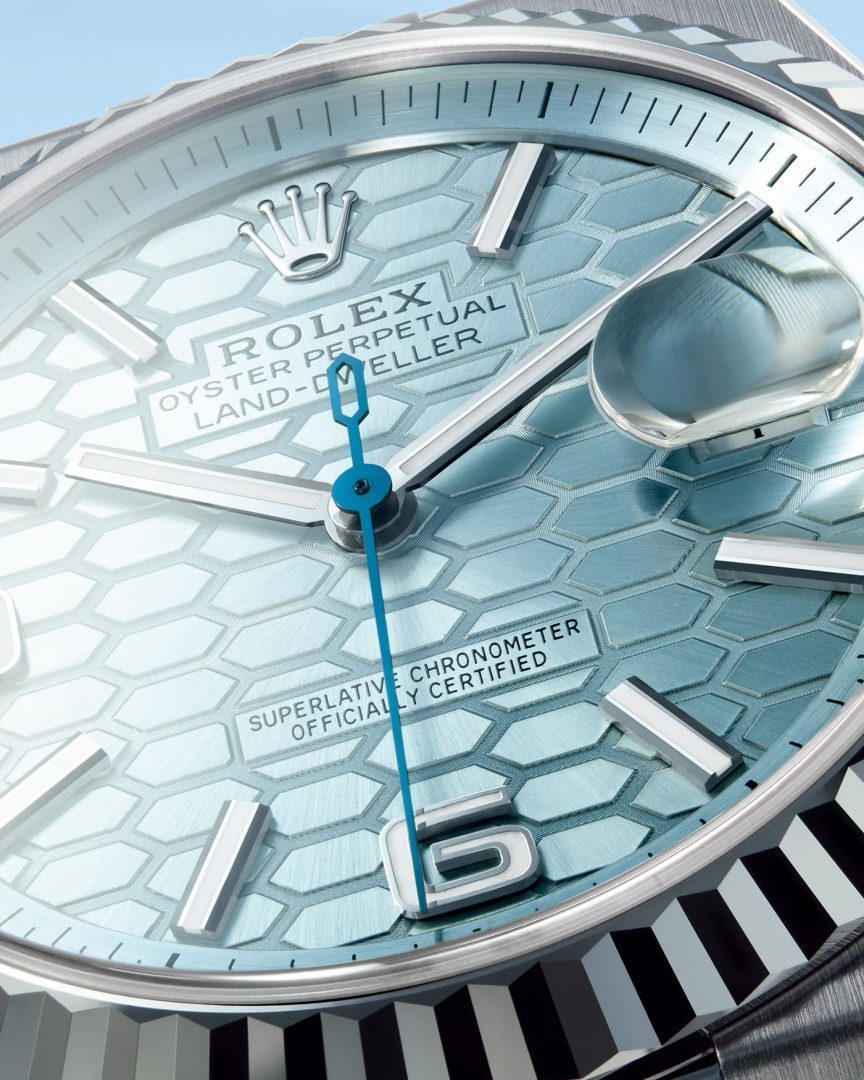 The Land-Dweller’s honeycomb-patterned dial stands out as a distinctive feature and represents a breakthrough in Rolex’s modern design language. Created using femtosecond laser technology and enhanced with etched micro-textures along each cell’s edges, the dial achieves a remarkable sense of depth and dynamic interplay of light and shadow.