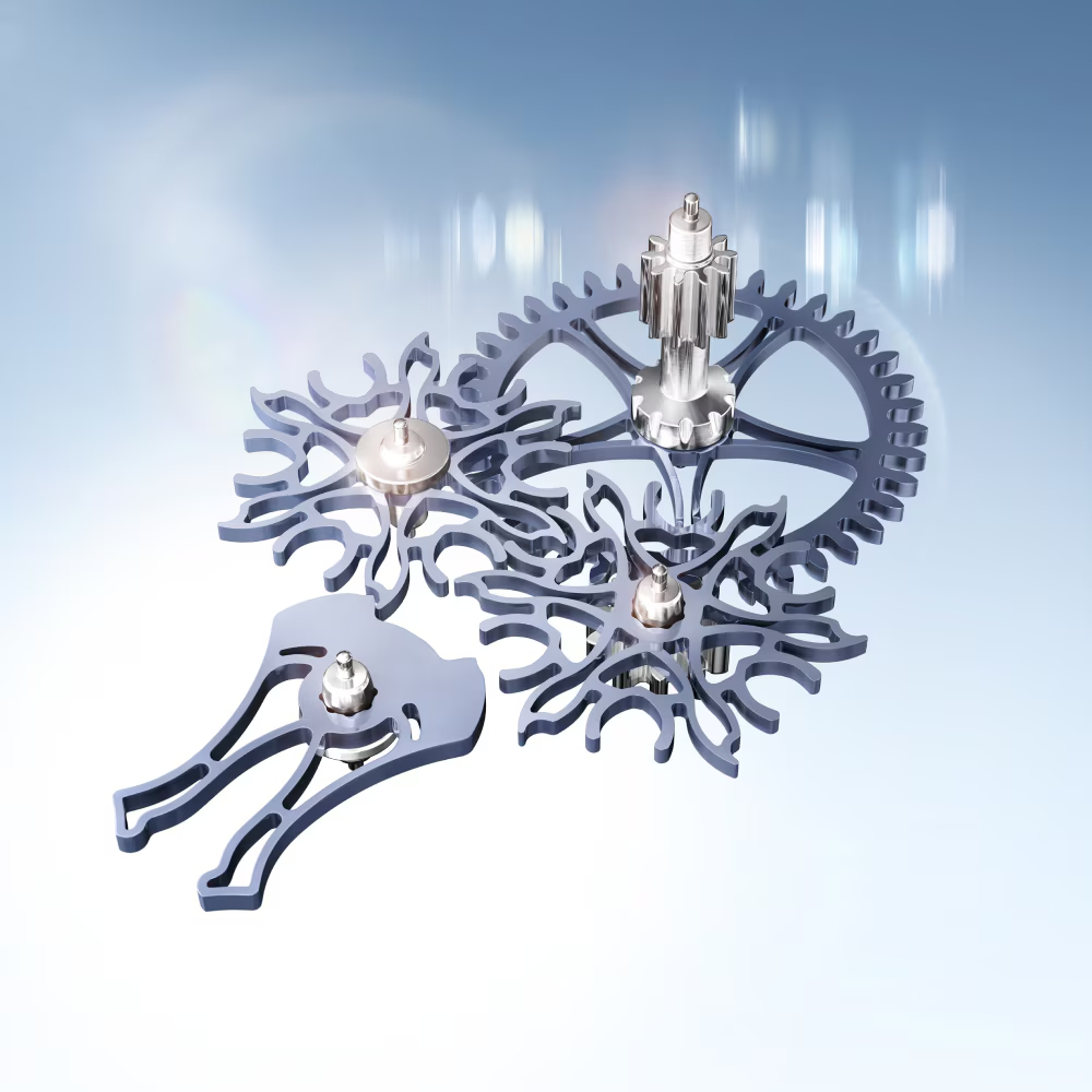 The components of the Dynapulse escapement system feature a number of patented innovations. One key patent relates to the design of the silicon intermediate wheel, which is unique in that both the gear teeth and the impulse blades lie on the same plane. This wheel serves a dual purpose: its teeth engage with the rest of the gear train, while also positioning and guiding the impulse rocker with precision.