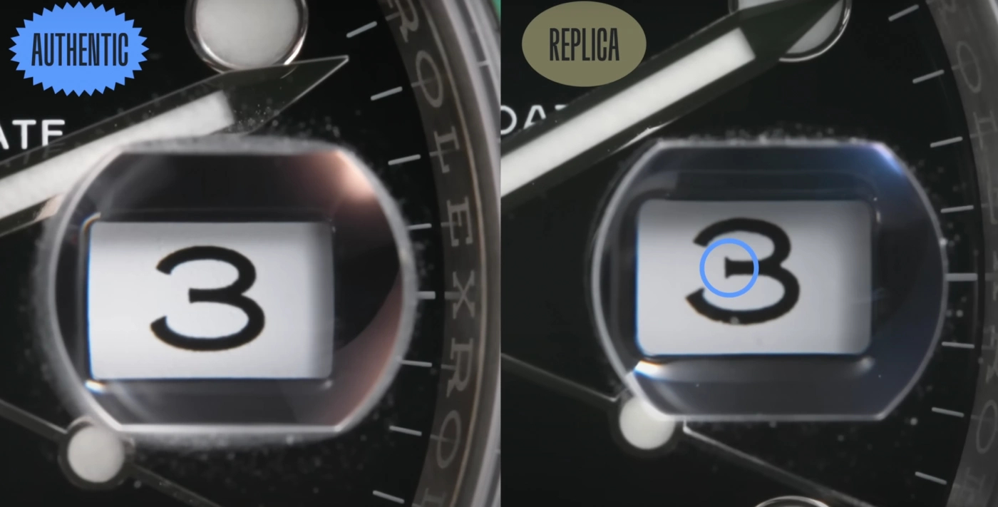 For the date font itself, to verify it you would need an authentic watch to compare side by side. Usually the font is pretty much the same, however, under detailed inspection, some numbers might have giveaways, like this peak in this particular number 3.