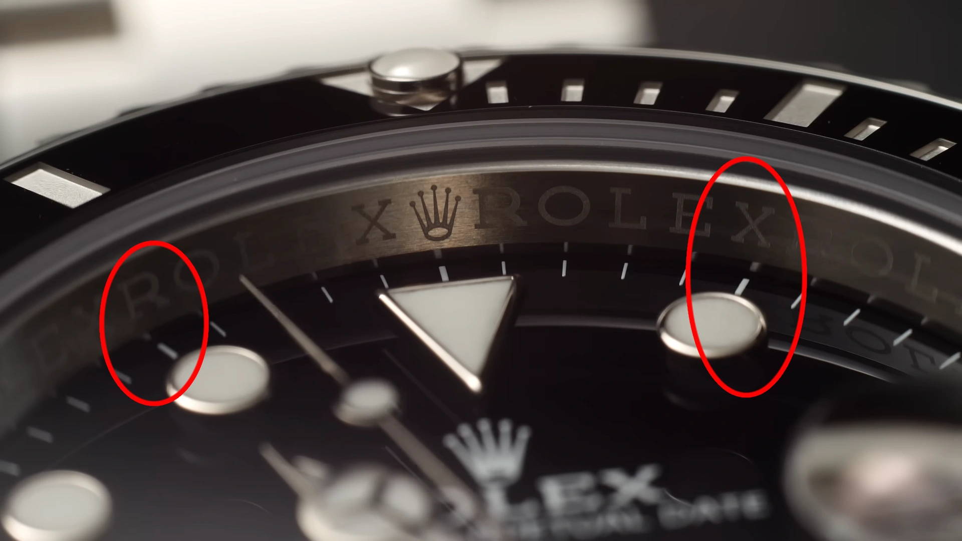 Another thing to look out for is, on the right-hand side of the dial, one o’clock down to five o’clock, the “X” of “Rolex” is going to line up with the hour markers. On the left-hand side of the dial, so seven o’clock up to 11 o’clock, the “R” of “Rolex” is going to line up with the hour markers. Sometimes, even higher-end superclones get the positioning wrong.