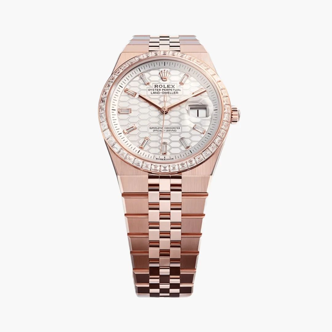 Rolex Oyster Perpetual Land-Dweller Ref. 127285TBR features a 36mm Everose gold case with a diamond-set bezel and a pure white honeycomb-pattern dial. It is fitted with a refined Flat Jubilee bracelet for a modern, integrated look. Powered by the Calibre 7135 automatic movement, it offers a 66-hour power reserve and is Superlative Chronometer certified. Water-resistant to 100 meters.
