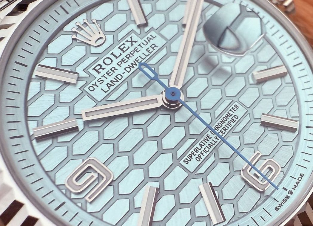 The Land-Dweller’s honeycomb-patterned dial stands out as a distinctive feature and represents a breakthrough in Rolex’s modern design language. Created using femtosecond laser technology and enhanced with etched micro-textures along each cell’s edges, the dial achieves a remarkable sense of depth and dynamic interplay of light and shadow.