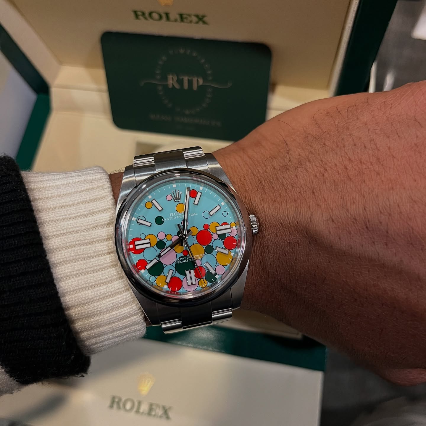 The Rolex Oyster Perpetual Ref M124300-0008 superclone showcases the playful Balloon Dial in vibrant tones, classic 41mm Oyster case, and precise Swiss 3230 movement. A flawless replica Rolex that fuses iconic design with superlative craftsmanship.