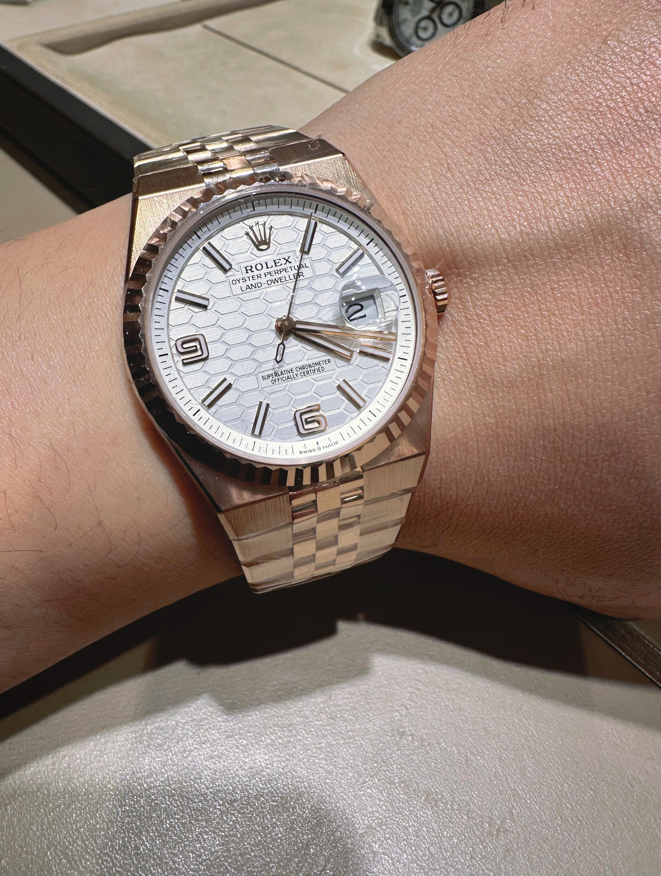 | Bracelet | – Oyster Bracelet with Three-Piece Solid Links – Solid 904L Stainless Steel with 18k White Gold Plating – Solid Screw Links for Easy Adjustment – Folding Oysterclasp with Easylink 5mm Comfort Extension |